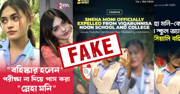 ভাইরাল হওয়া সেই ছাত্রী স্নেহা মনিকে বহিষ্কার করেনি ভিকারুননিসা নূন স্কুল অ্যান্ড কলেজ কর্তৃপক্ষ। পরিবারের আবেদনের প্রেক্ষিতে তাকে ট্রান্সফার সার্টিফিকেট (টিসি) দেওয়া হয়েছে বলে জানিয়েছেন প্রতিষ্ঠানটির অধ্যক্ষ মাজেদা বেগম। এছাড়ও তিনি এইচএসসি পরীক্ষার্থী ছিলেন না বলেও জানান অধ্যক্ষ।