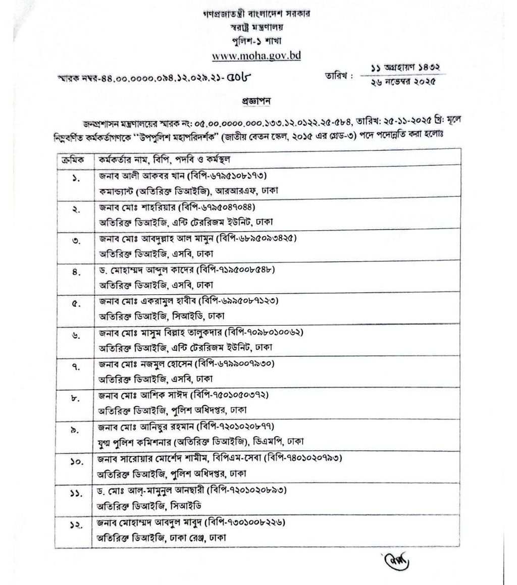 অপর এক আদেশে ‘সুপারনিউমারারি’ উপ-মহাপরিদর্শক (ডিআইজি) হিসেবে দুই কর্মকর্তা পদোন্নতি পেয়েছেন। তারা হলেন, ঢাকা মহানগর পুলিশের যুগ্ন কমিশনার মোহাম্মদ এনামুল হক ও সিলেটের রেঞ্জ রিজার্ভ ফোর্সের কমান্ড্যান্ট মো. হুমায়ুন কবীর। গণপ্রতিনিধিত্ব আদেশ (আরপিও) অনুযায়ী, তফসিল ঘোষণার তারিখ থেকে নির্বাচনের ফল ঘোষণার পর ১৫ দিন অতিক্রান্ত না হওয়া পর্যন্ত নির্বাচন কমিশনের অনুমতি ছাড়া ভোটের দায়িত্বপ্রাপ্ত কর্মকর্তাদের বদলি করা যাবে না।